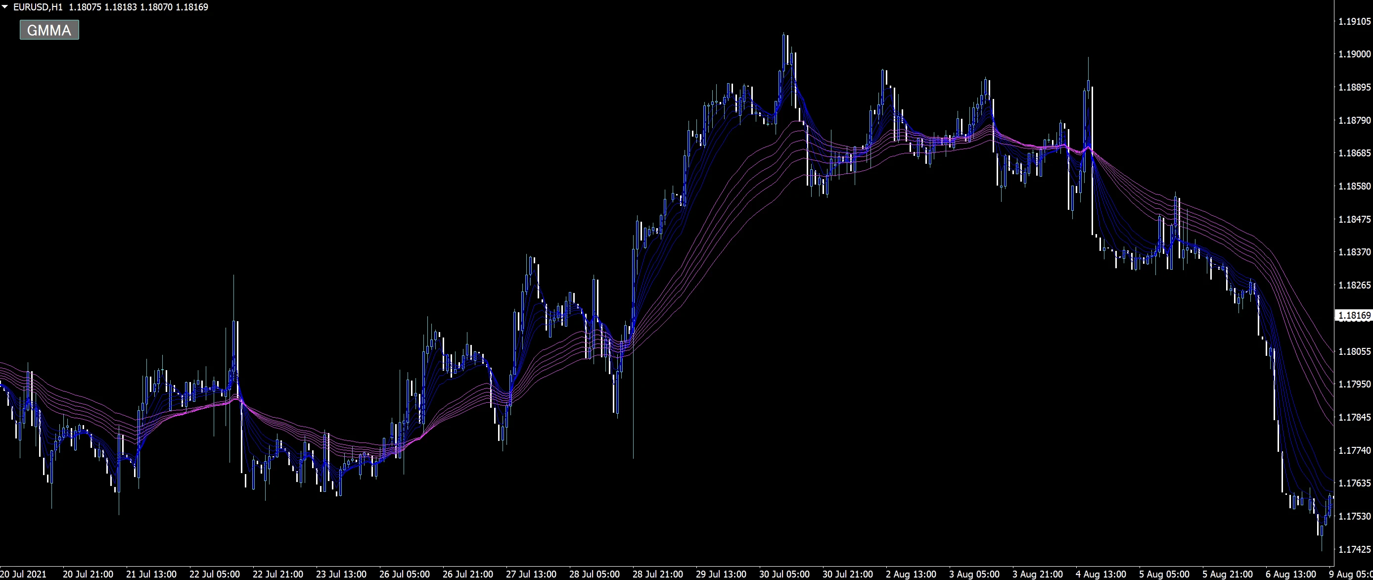GMMA(ガンマ)とは...6本のEMAから成り立つインジケーターです。別名、複合型移動平均線とも呼ばれます。