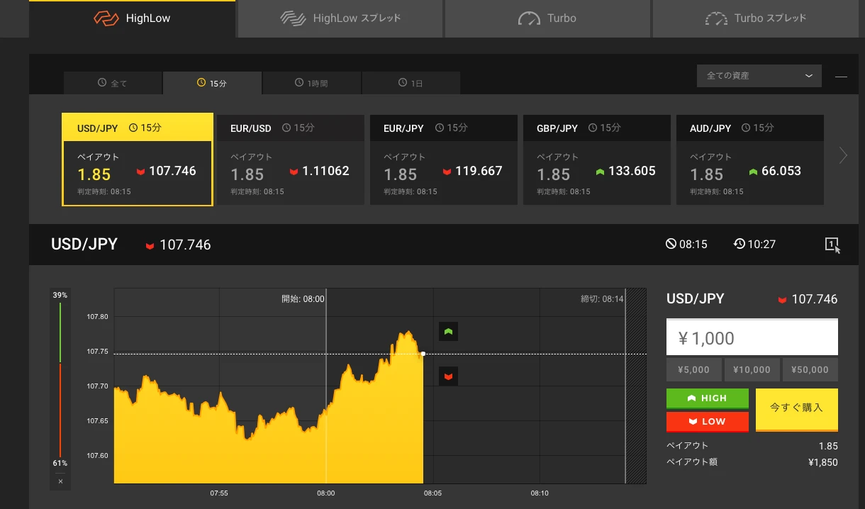 ハイロー15分取引のペイアウト率は1.88倍から1.85倍になったことで、損益分岐の勝率が、従来の「約53.2%」から「約54.1%」へと変更になりました。言い換えると、バイナリーオプションでお金を増やすために必要な勝率が「約0.9%」も上がったということになります。