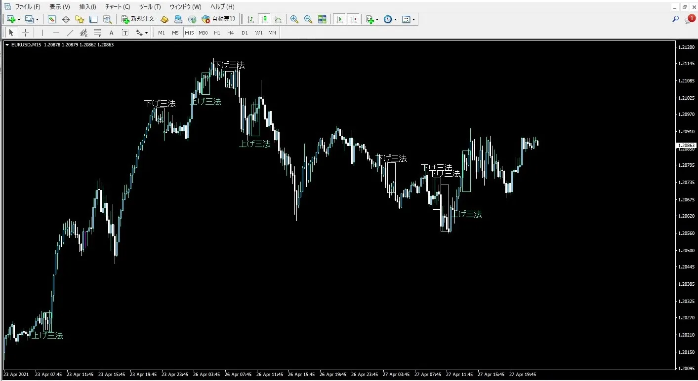 今回はサイキックスが作成し、無料で配布しているローソク足パターン「上げ三法・下げ三法をシグナル表示させるインジケーター」を例にとってMT4にインジケーターを保存していきます。