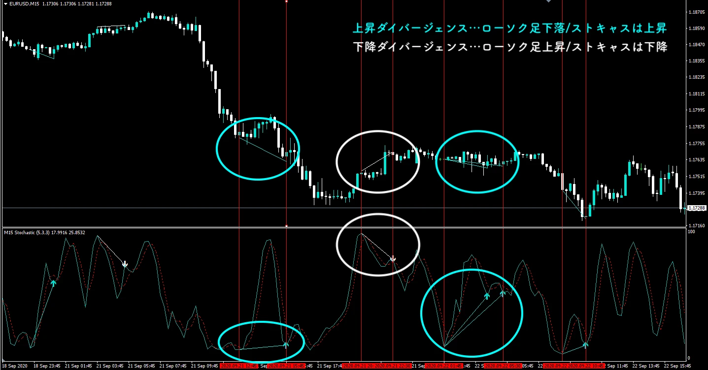 ストキャスティクスのトレードで使用する際の使い道として値から買われすぎ売られすぎを判断するのに加えローソク足とオシレーターが逆行していないかをみることでトレンド転換を予測する「ダイバージェンス」があります。