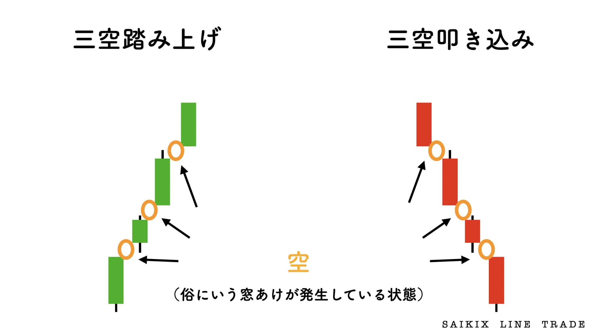 三空叩き込みとは(さんくうたたきこみ)…安値圏で、4本の陰線と3つの下方向の空が連続する酒田五法のローソク足パターンの1種