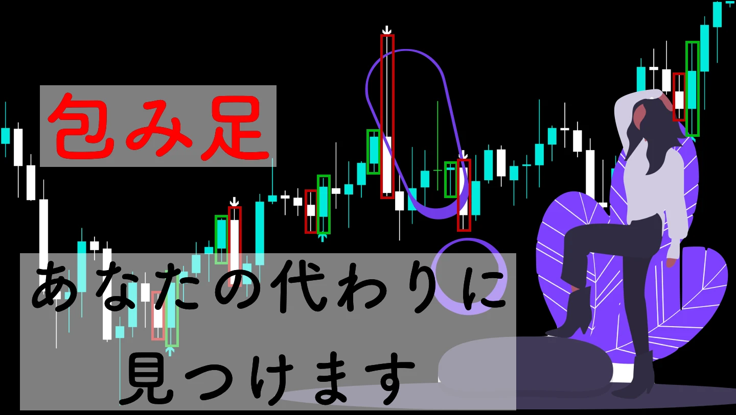 インサイドバー(はらみ足)とよく一緒に使われるのが、「包み足(つつみあし、アウトサイド)」です。プロの投資家が絶対見逃さないとさえ言われています。前足を現在足がつつみかぶさっている「包み足」はレンジ相場のブレイクアウト、相場の反転を示唆します。包み足逆張りツールでは、自動で包み足の発生を検知し、教えてくれます。