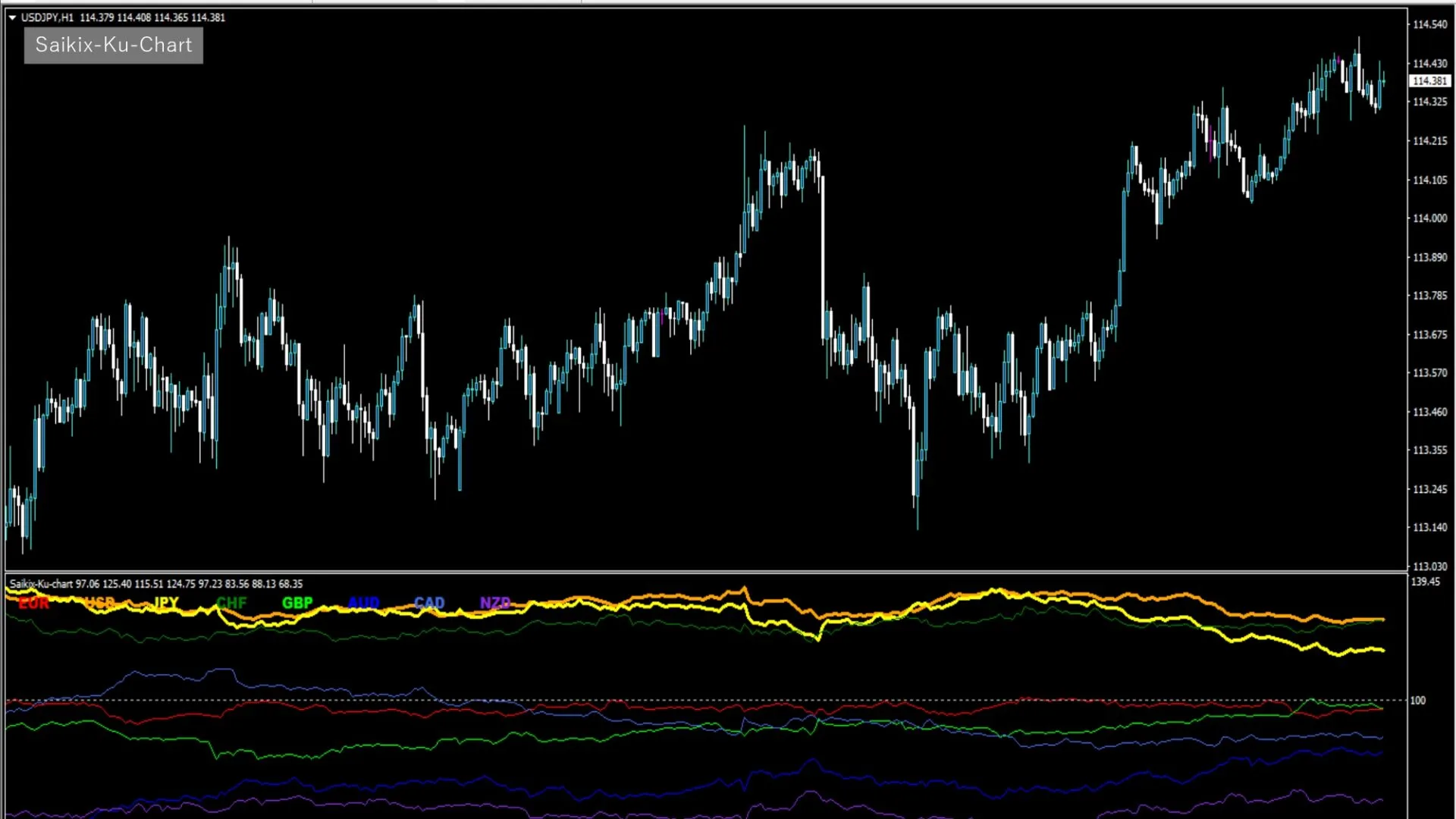 Ku-Chart(クーチャート)自体は、2000年初期からあった有名なインジケーターで、相場環境認識を行う時の強力な武器として、プロのトレーダーにも使われてきました。「Saikix-Ku-Chart.ex4」は既存のクーチャートを完全日本語化し、2022年用に使い勝手を向上、指定の通貨ペアがチャンスになったら通知がくるようアラートを設定したインジケーターです。