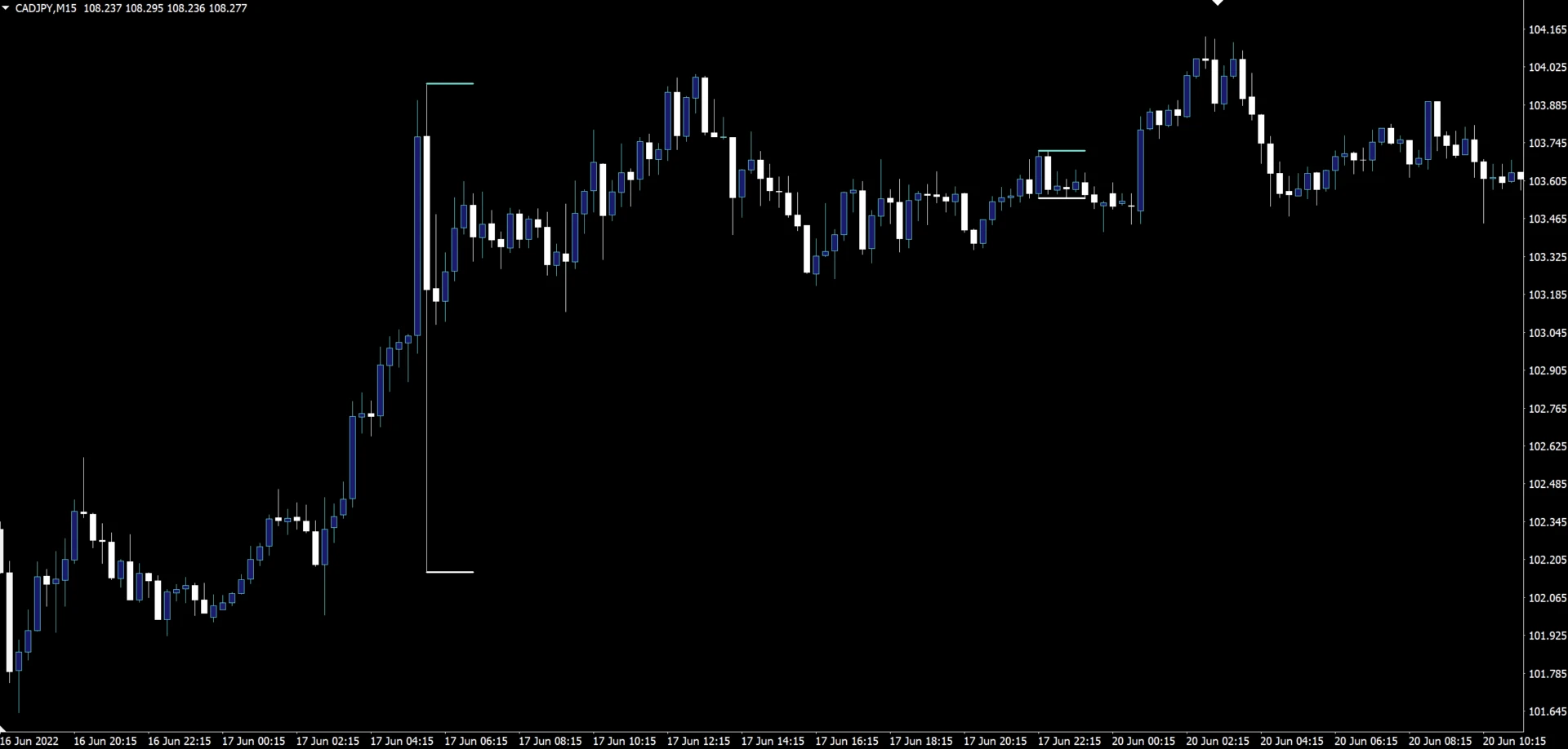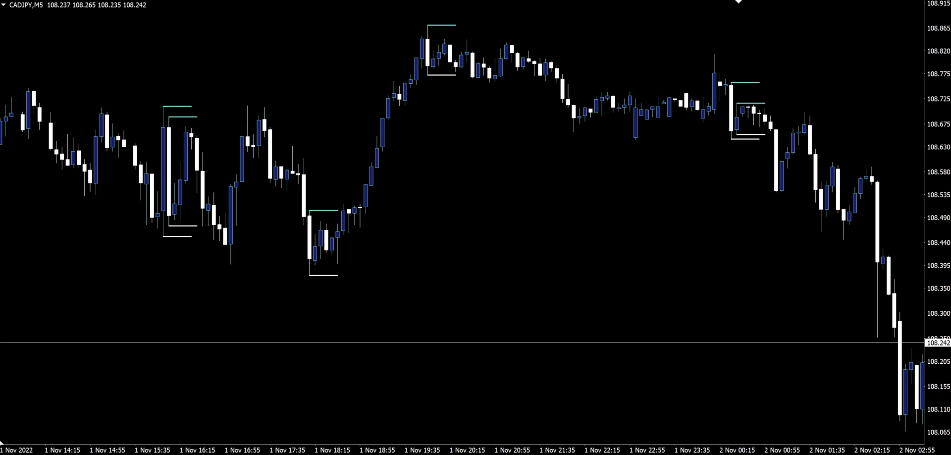 インジケーターを導入するだけで、マスターキャンドルを自動検出し、高値と安値にラインが自動で引かれます。タイミングでもたついている局面や短期トレンド転換が起きる場面でマスターキャンドルが多く出ていることがわかります。