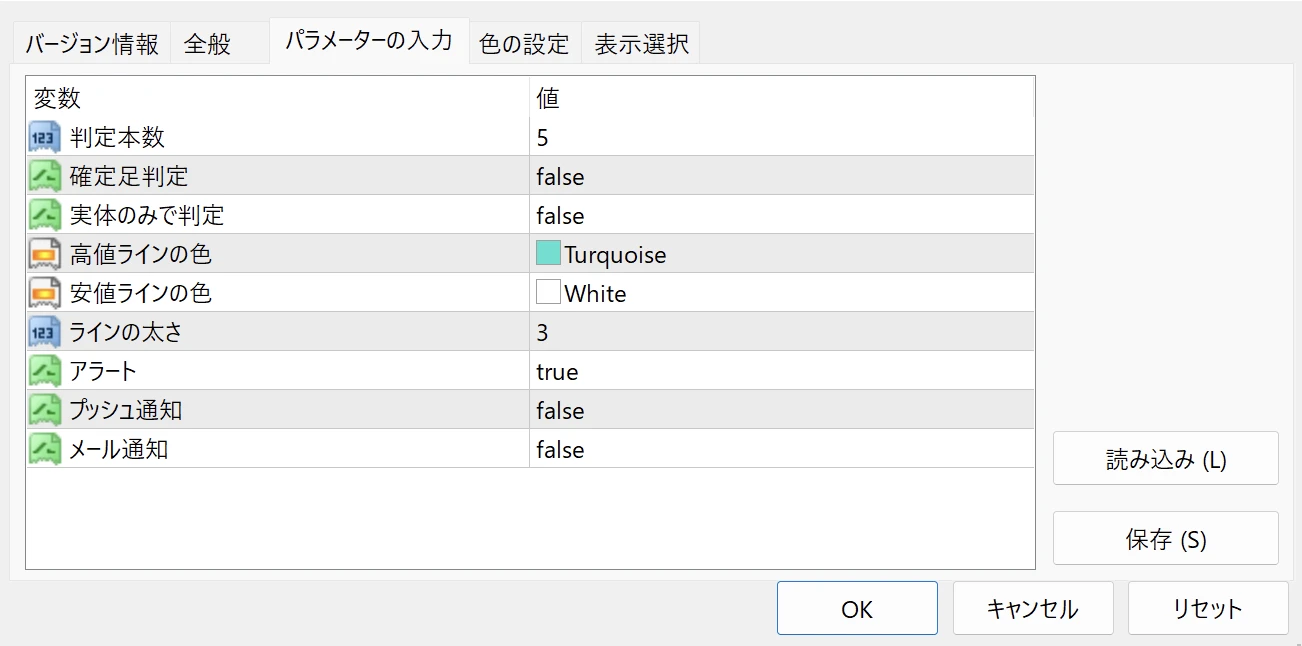 - 確定足判定...trueにすると確定足ベース(次足で切り替わるタイミング)でサインが出現され、falseだと条件が成立出した瞬間にサインが出現(falseの場合は、後のプライスアクションのよってサインが取り消されることも)