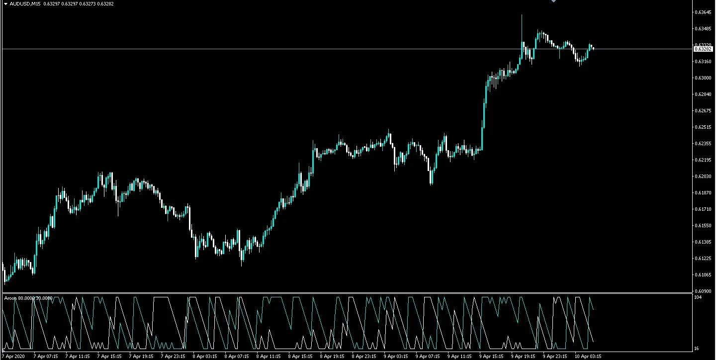 アルーンアップが80を上回ると「直近で何度も高値を更新している=強い上昇トレンド」が発生していて、逆にアルーンダウンが80を上回ると「直近で何度も安値を更新している=強い下降トレンド」が発生していることを意味します。一方で、どちらも50付近をうろうろしているときは方向感のないレンジ相場です。