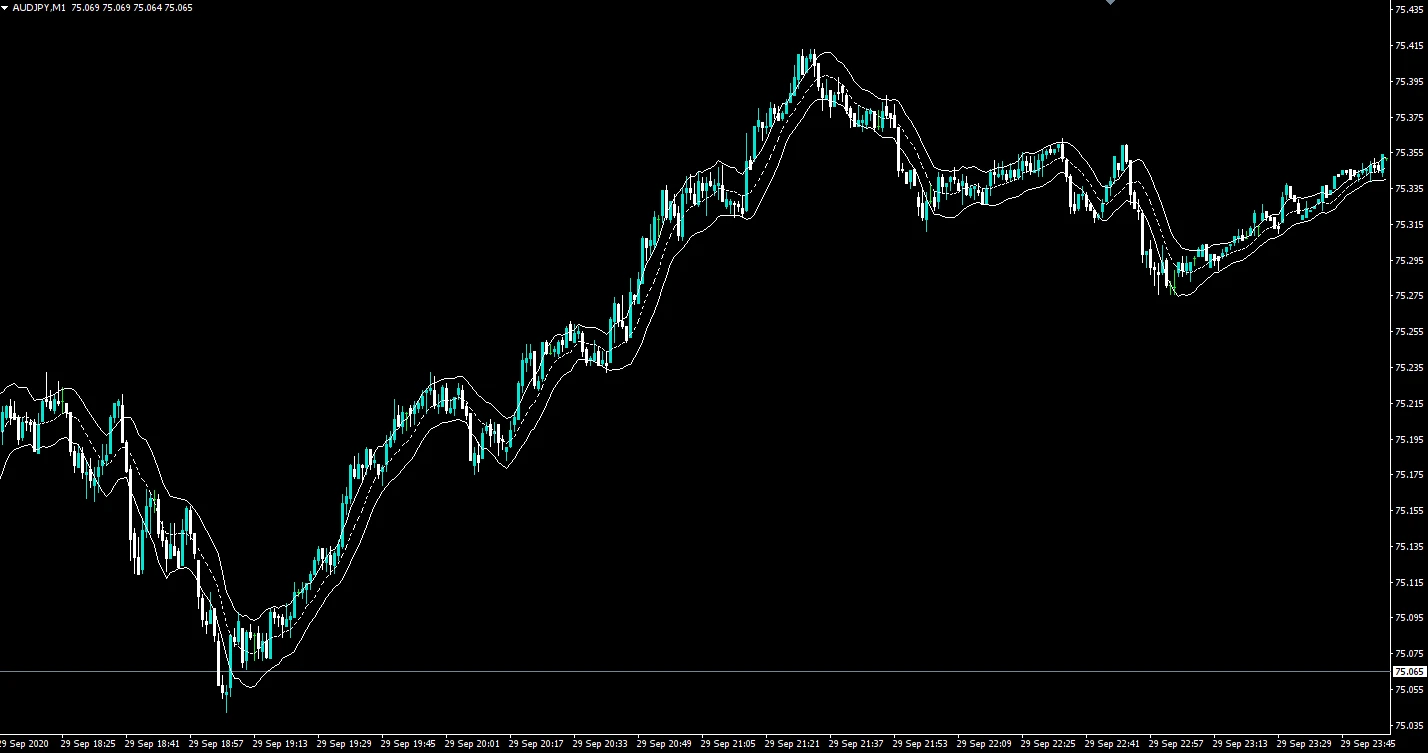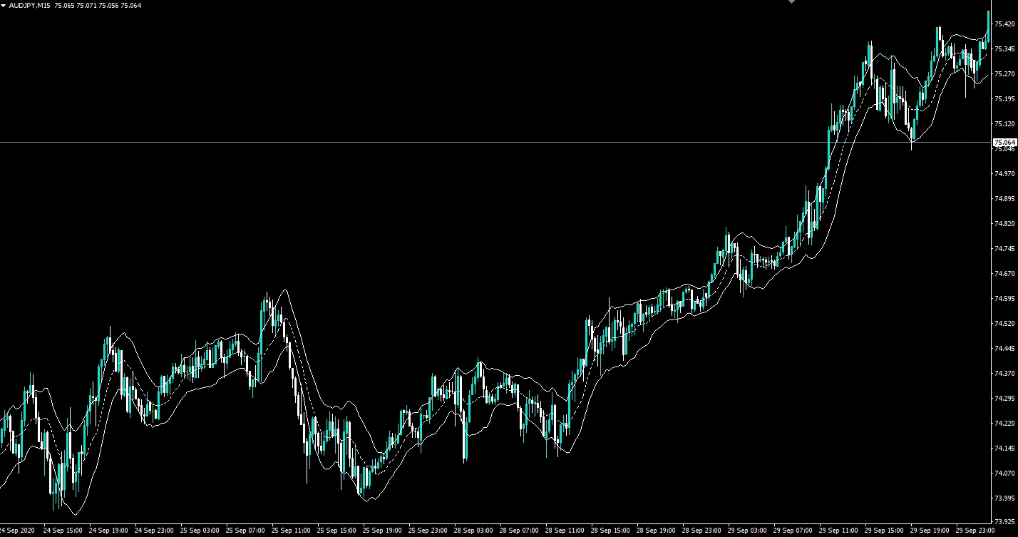 - 中央線(Middle Line) = 終値のn期間EMA(指数移動平均)