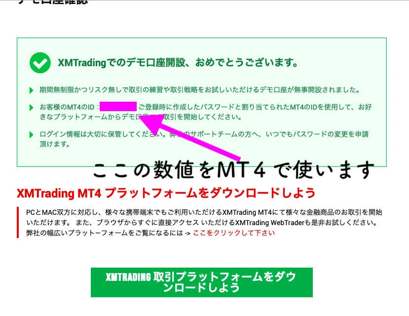 思いっきり文字化けしてますが画像の解説の通り上から順に「MT4専用のID」「パスワード」「デモ口座のサーバー種類」を入力しましょう。