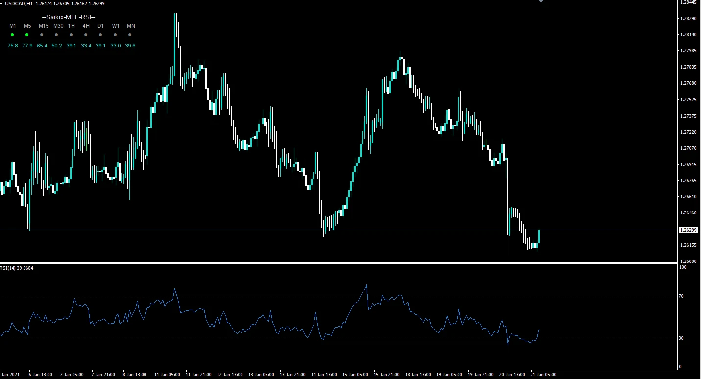 1分足から日足のRSIを一括表示したい、まとめてマルチタイムでRSIを監視したい、そう考えたことはないでしょうか?MT4に最初から搭載されているRSIでは1つの時間足しか表示することができず、上位足や下位足のRSIをみるばあいは、いちいち時間軸を切り替えなければいけません。RSIマルチタイムモニターを使うことで全ての時間軸のRSIを同時表示することができます。