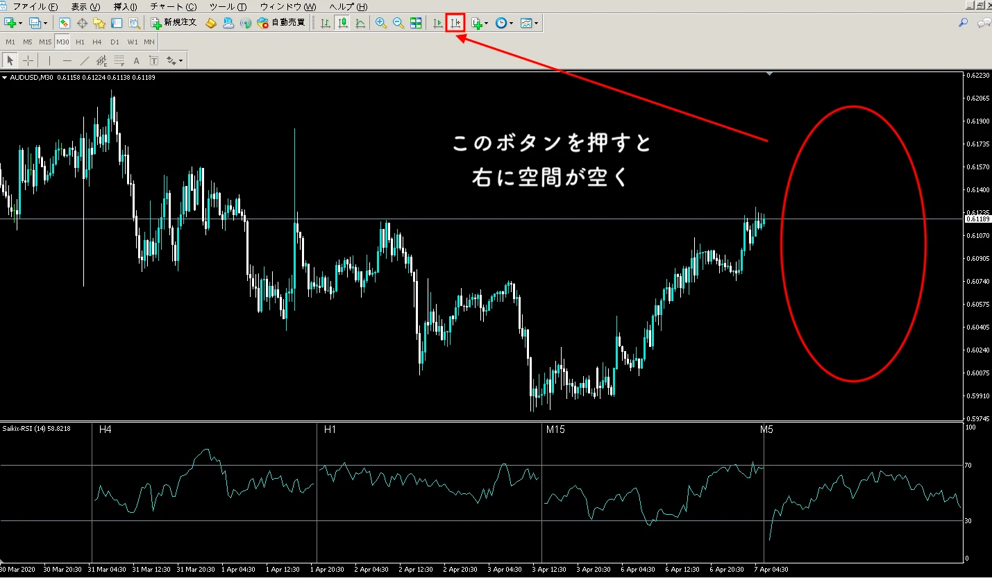 MT4の設定で上画像部分の赤四角部分のボタンを押すと、チャートが最新価格に飛び、右に空間が空きます。trueにするとボタンを押した状態に最適化され、falseの場合には最新価格に合わせて表示されます。
