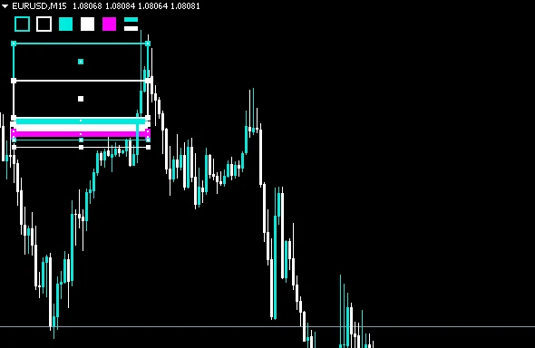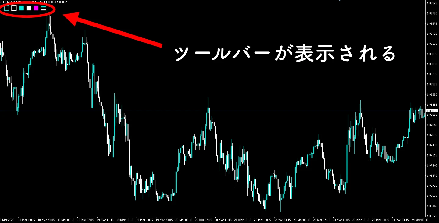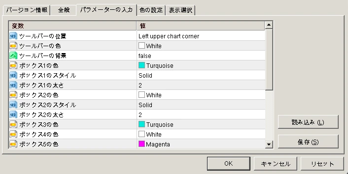 Saikix-LINE.ex4は色別でトレンドラインやボックスを引けるツールバーを表示し、MT4の機能を拡張してくれるインジケーターです。右上のツールバーからクリックすることで指定の色のボックスやトレンドラインがすぐに引けます
