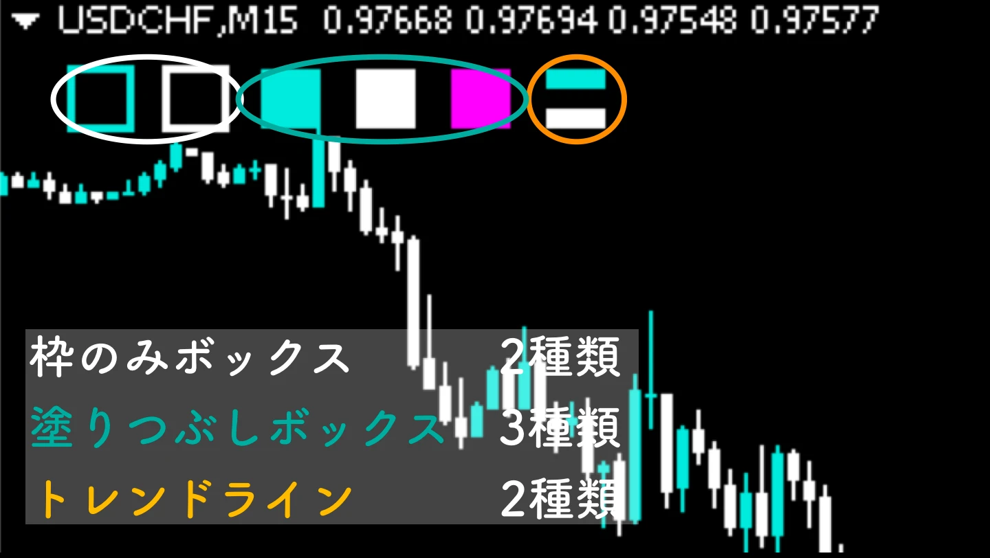 ライントレードで水平ライン、トレンドライン、ボックス(長方形)を引くときに、全て同じ色だと「どこに対して引いたラインなのかわからなくなってしまうこと」が多々あります。ライントレーダーにとってラインでのミスを減らすことは最優先になります。