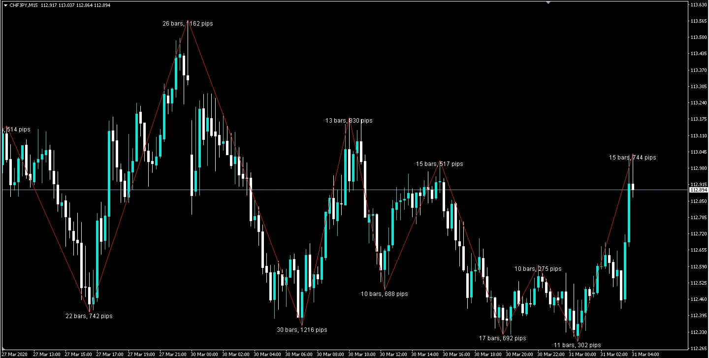 自分で前回高値と前回安値を見つける際にどこかを1発でわかることに加えて、前回安値から前回高値までのひとつの波が何pipsで、ローソク足何本かけて作られたのかというのを見ることができます。