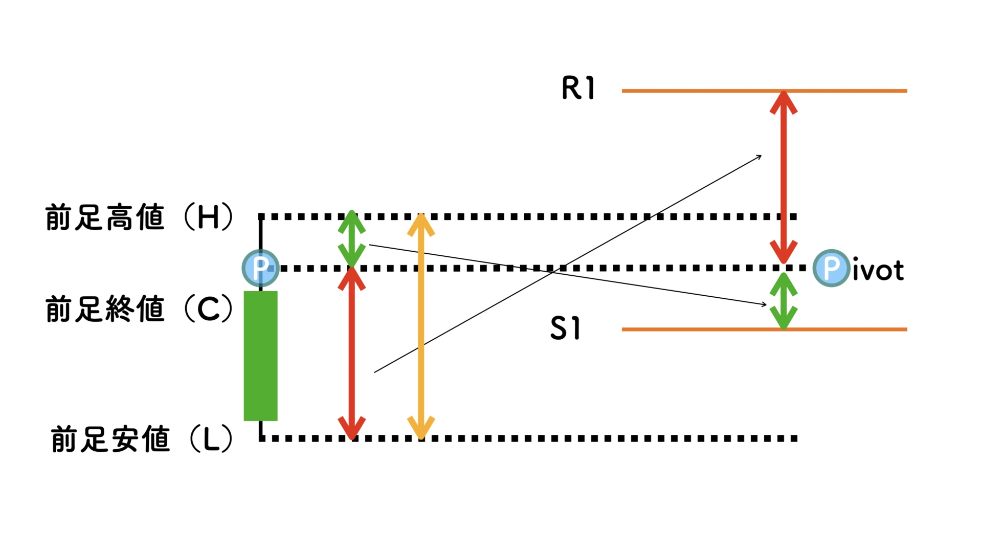 R1はピボットから「ピボットと前日安値までの距離」を足し、S1はピボットから「ピボットと前日高値までの距離」を引いた値になります。