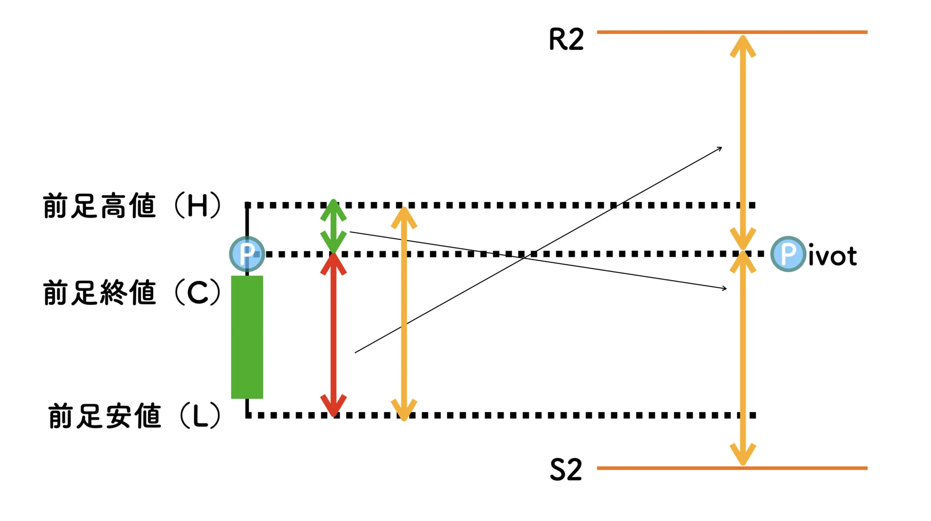 言い換えると、R3は「ピボットから前日安値までの距離+前日高値から前日安値までの距離」、S3は「ピボットから前日高値までの距離+前日高値から前日安値までの距離」となります。