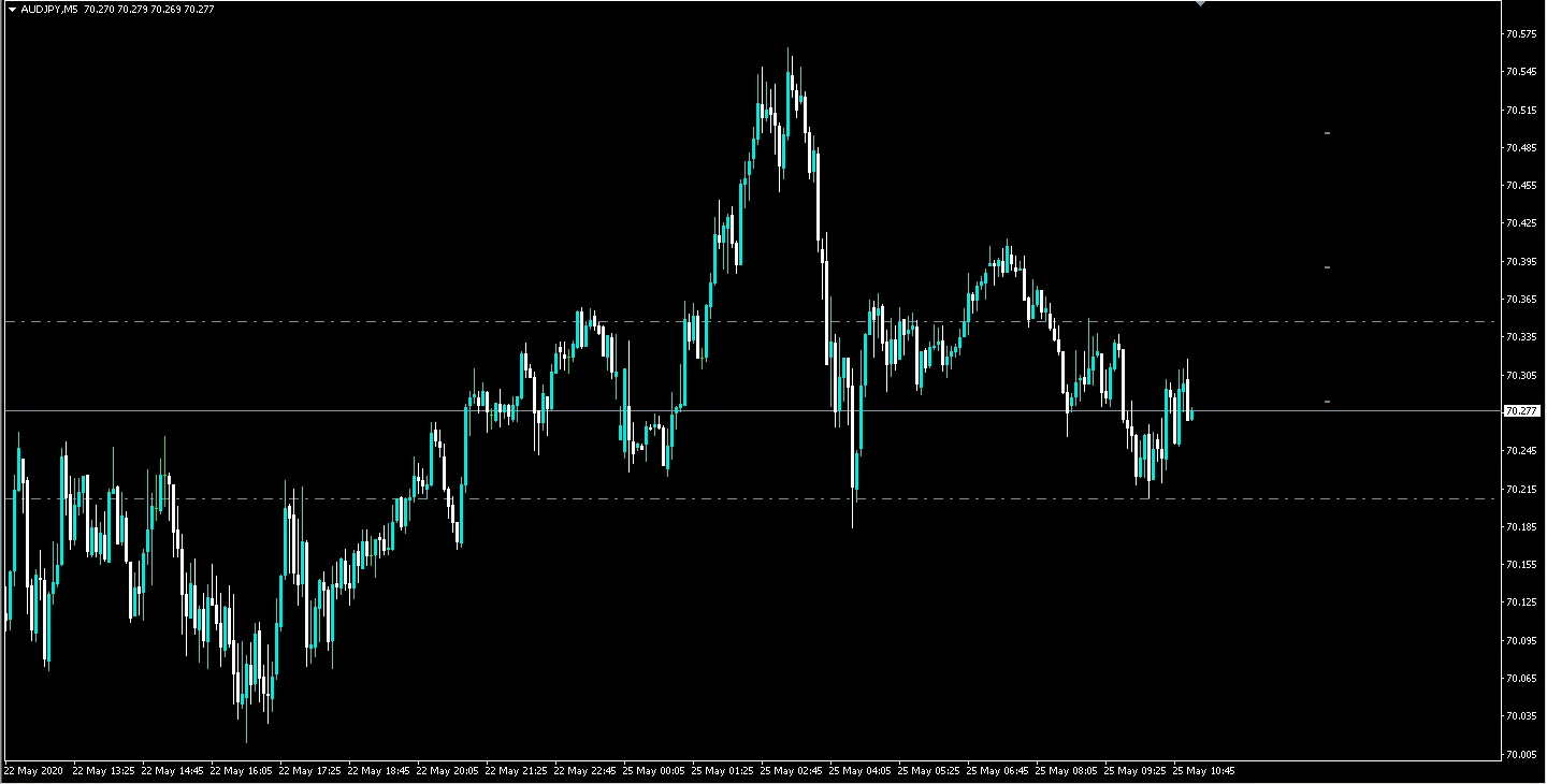ライン自体は現在価格に合わせて変動(リペイント)するので、一生ラインタッチすることはありません。そのため、値幅トレードとしてエントリーの候補、利確の候補として自動値幅ラインを引く場合は、値幅ラインに重ねて水平線をご自身で引いていただく必要がございます。