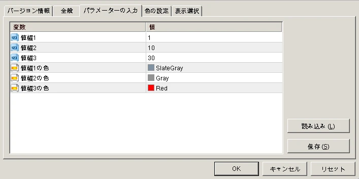 パラメーターの入力の「値幅1〜値幅3」の数字を変更することでラインを引く値幅を自由に変えることができます。初期設定では0.1%水準、1%水準、3%水準となっていますが、10%水準、20%水準などの大きな値幅も設定することができます。
