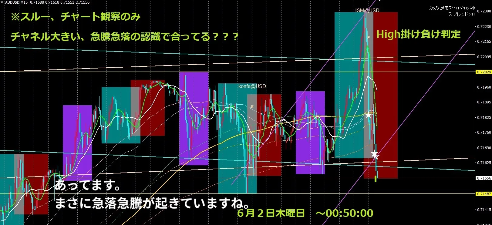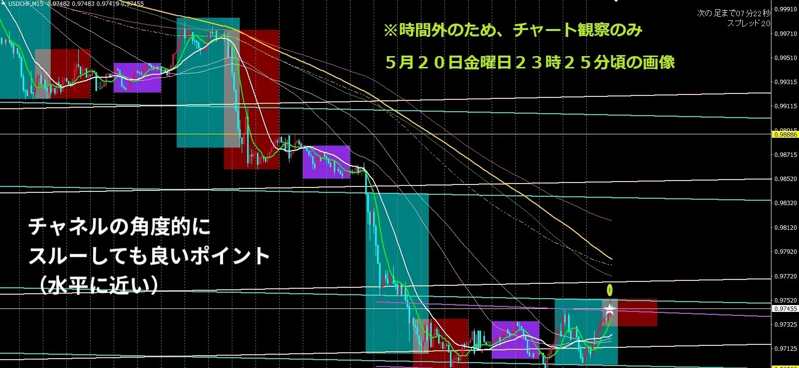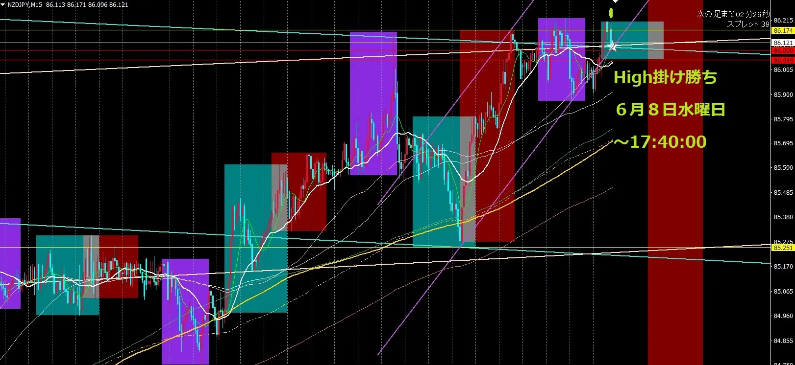 Benefit Duo1ex4では、主に前々回高値から前回高値の角度、前々回安値から前々回安値の角度とサイクル、ローソク足、ボラティリティ、定義付けをして、チャネルトレンド相場を検出し、順張りの逆張りに適しているポイントをラインとして描画したしています。