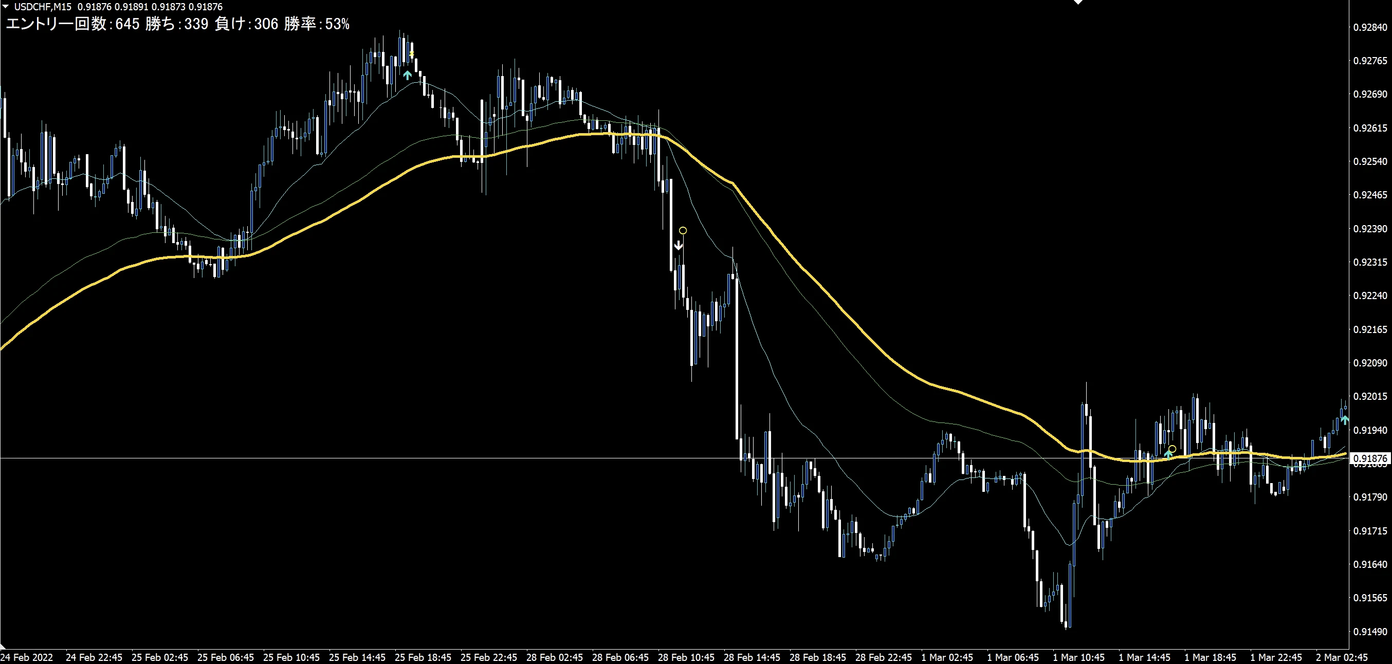 合計3本の移動平均線がわかりやすく「トレンド発生」を表しているパーフェクトオーダーの場所をピンポイントで視覚化し、強いトレンド発生、停滞相場のブレイク示唆などの順張りトレードに適しているかの判断に役立てることができます。逆にシグナルが頻出している相場は、移動平均線が何度もゴールデンクロス、デッドクロスを繰り返し絡みあっていて、停滞相場であることを示唆しており、順張りトレードには適していないため、避けることで勝率をあげることができます。