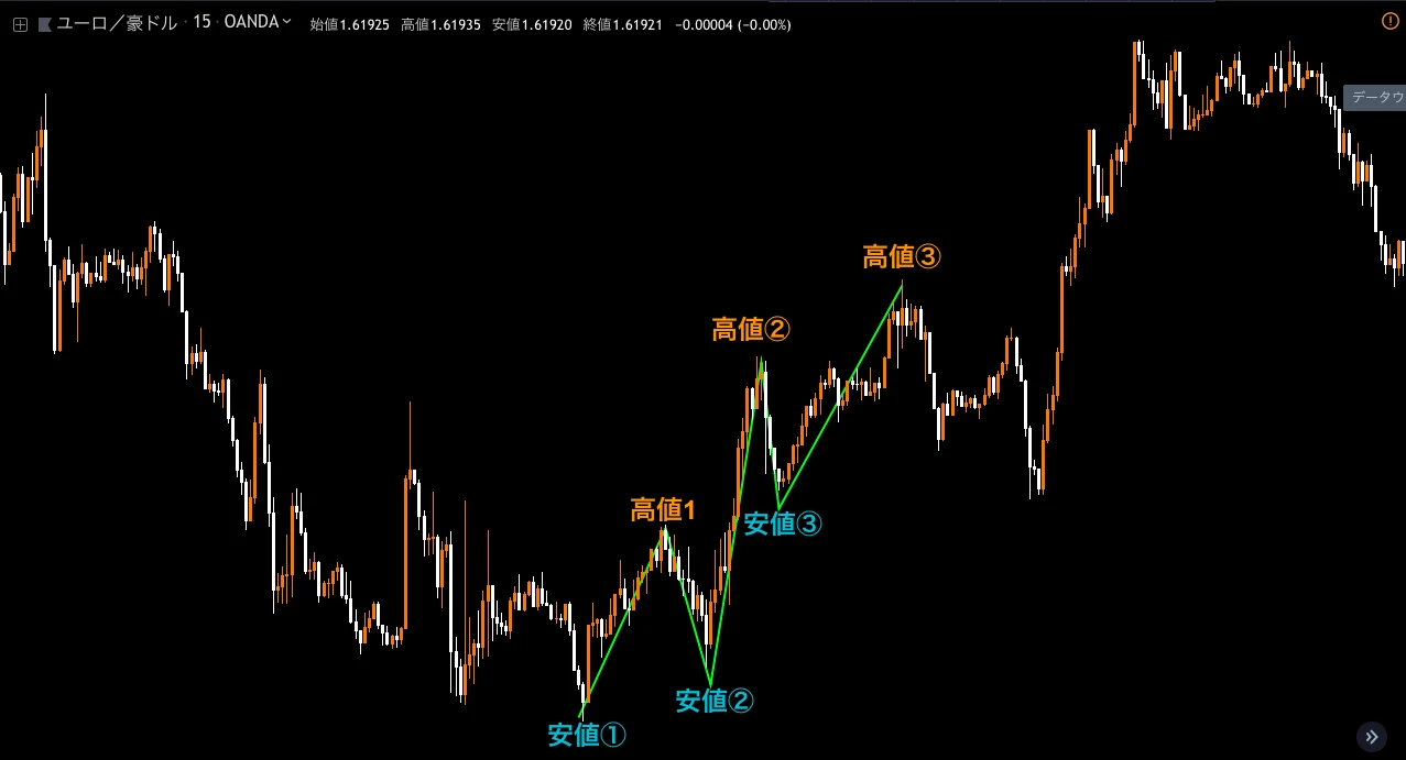 実際にトレーダーの中で「ダウ」という言葉はしばしば、トレンド継続/方向性の確認のための「高値・安値の切り上げ」「安値・高値の切り下げ」という意味で使われる場合があります。