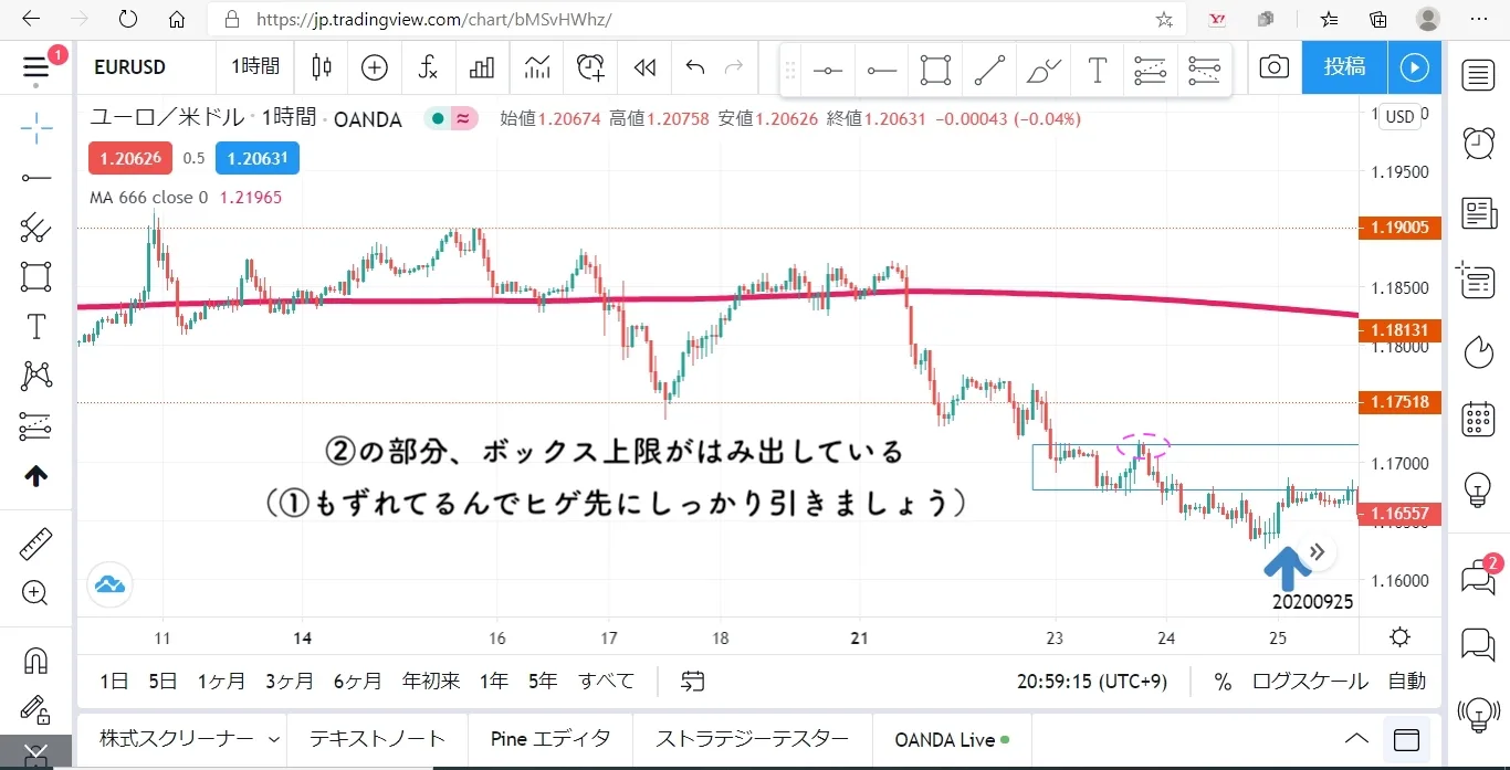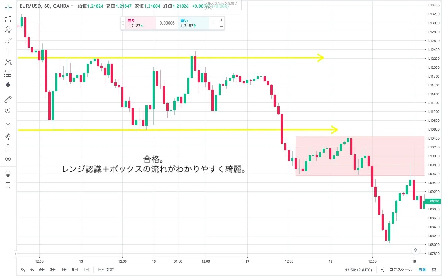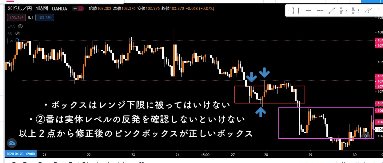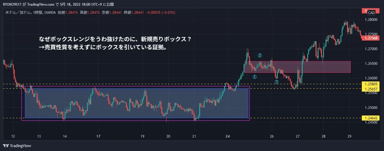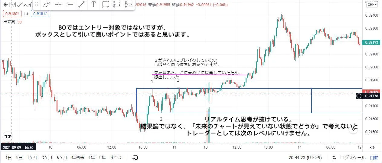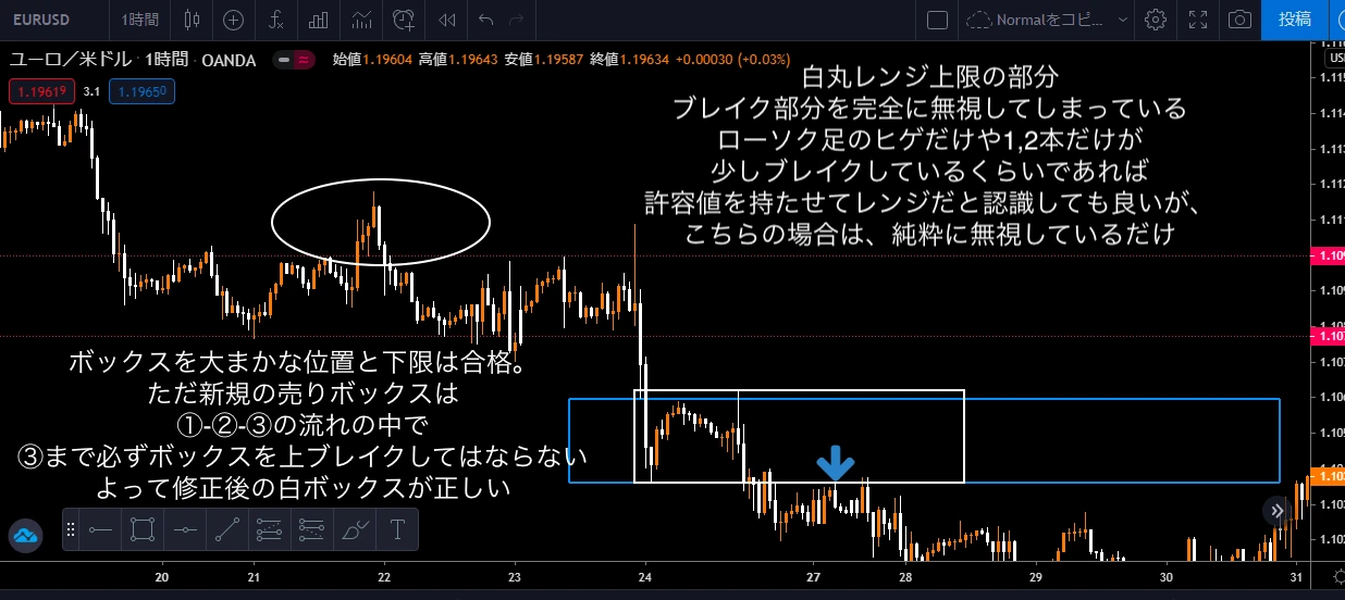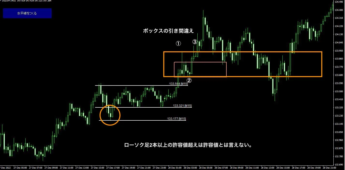 ボックス自体を見落としていたり、①→②の部分で前足の高値更新(買いボックスなら前足の安値更新)をしていないのにボックスを引いていたり、大抵のミスは簡単なミスで原因に気付いてあげればすぐに自分で直せるものです