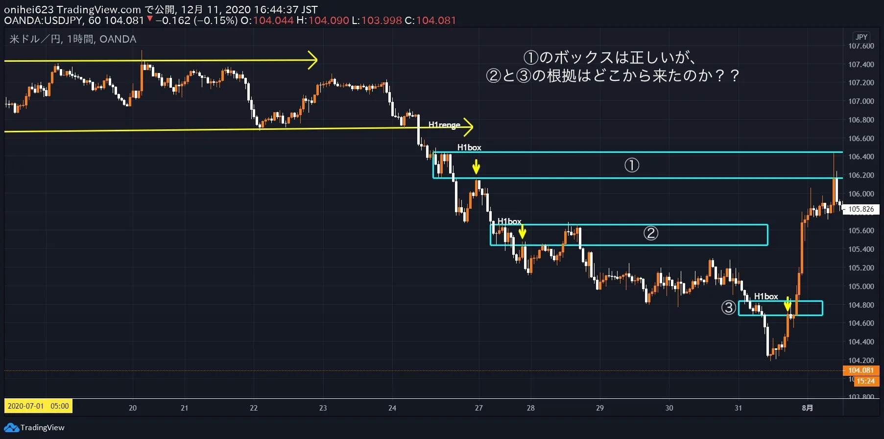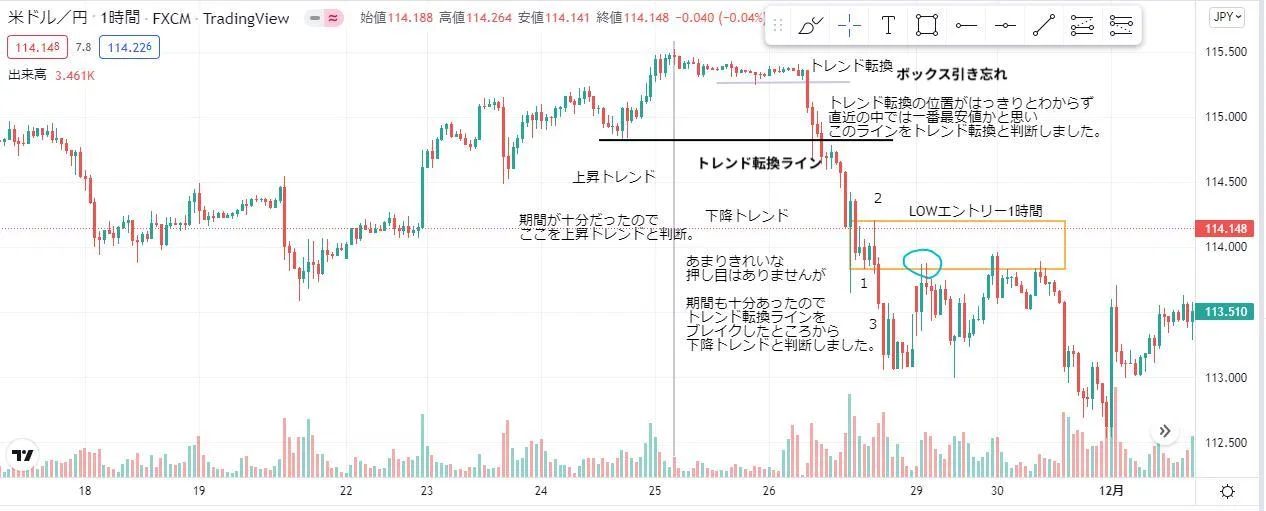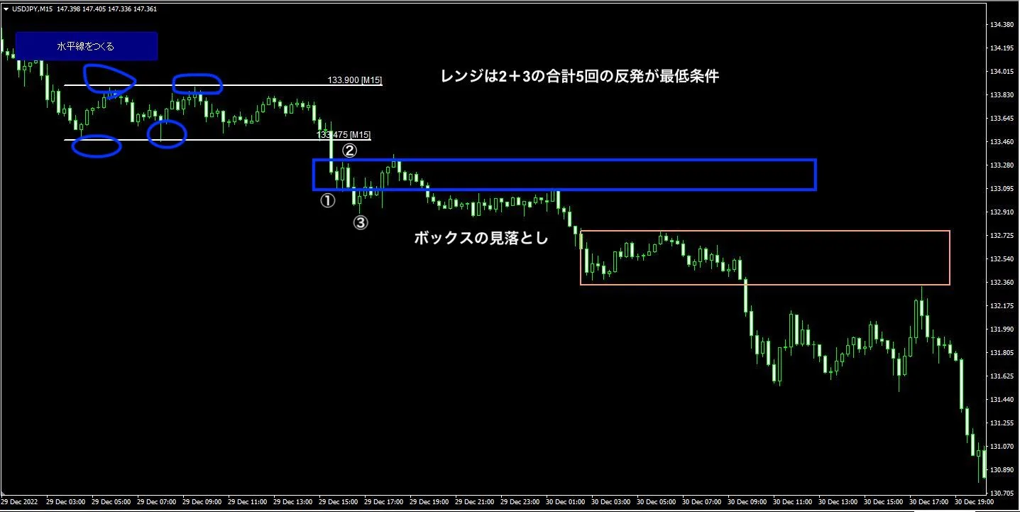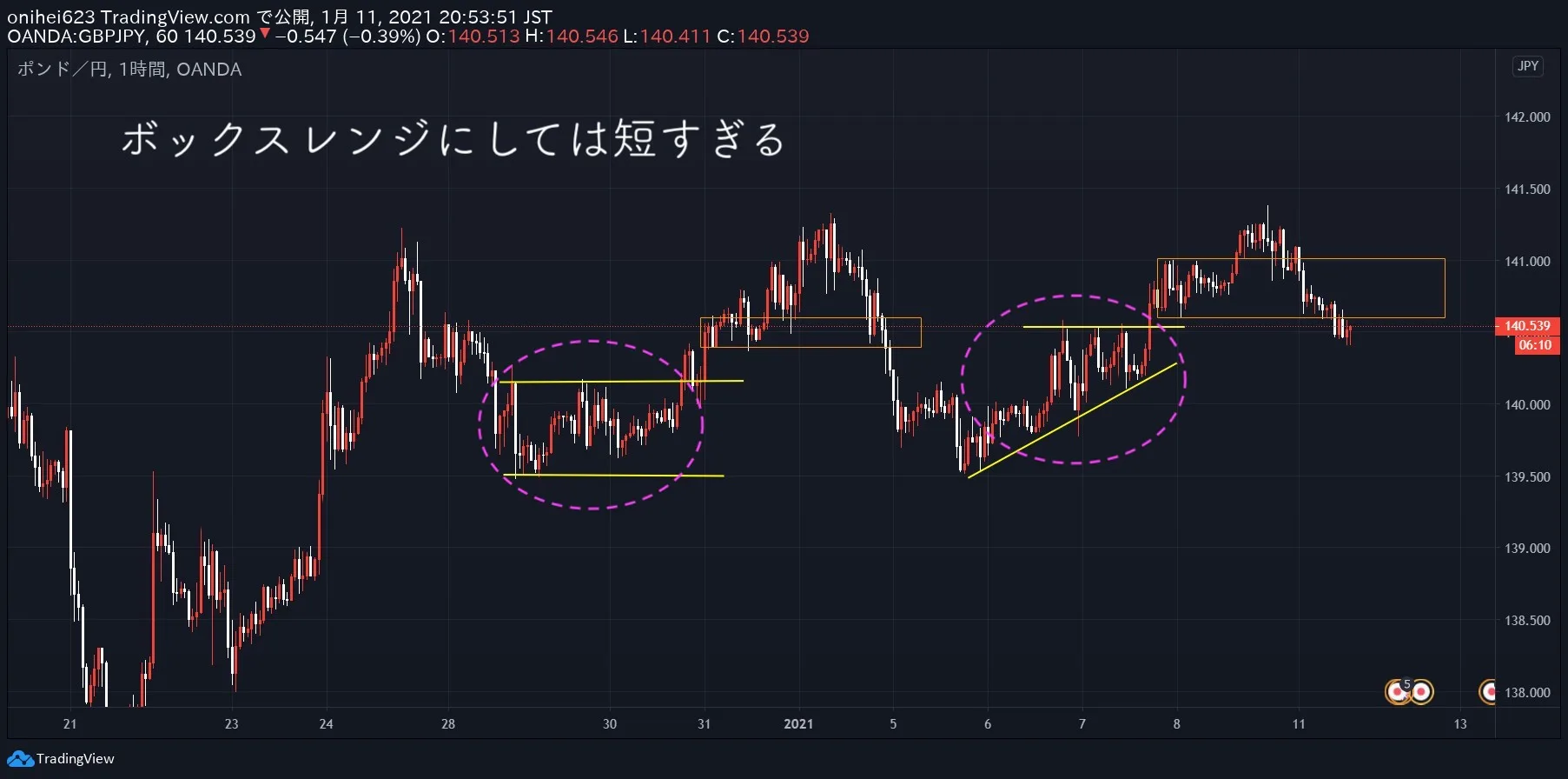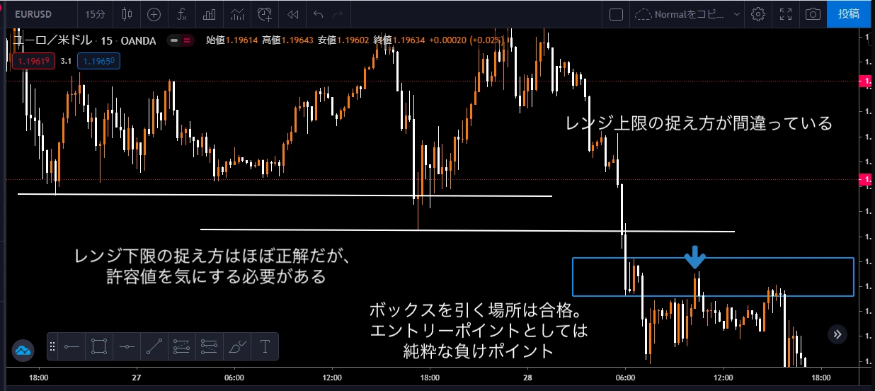 ボックス自体を見落としていたり、①→②の部分で前足の高値更新(買いボックスなら前足の安値更新)をしていないのにボックスを引いていたり、大抵のミスは簡単なミスで原因に気付いてあげればすぐに自分で直せるものです