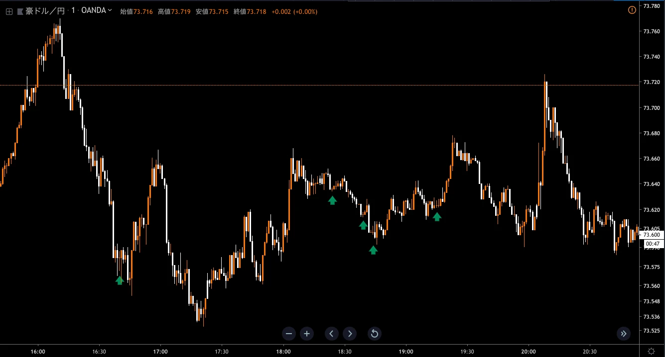 上記チャートでは1時間足のローソク足が1分足で見ると60本になって、ある程度波がはっきり読み取れるようになってる様子が見れます。