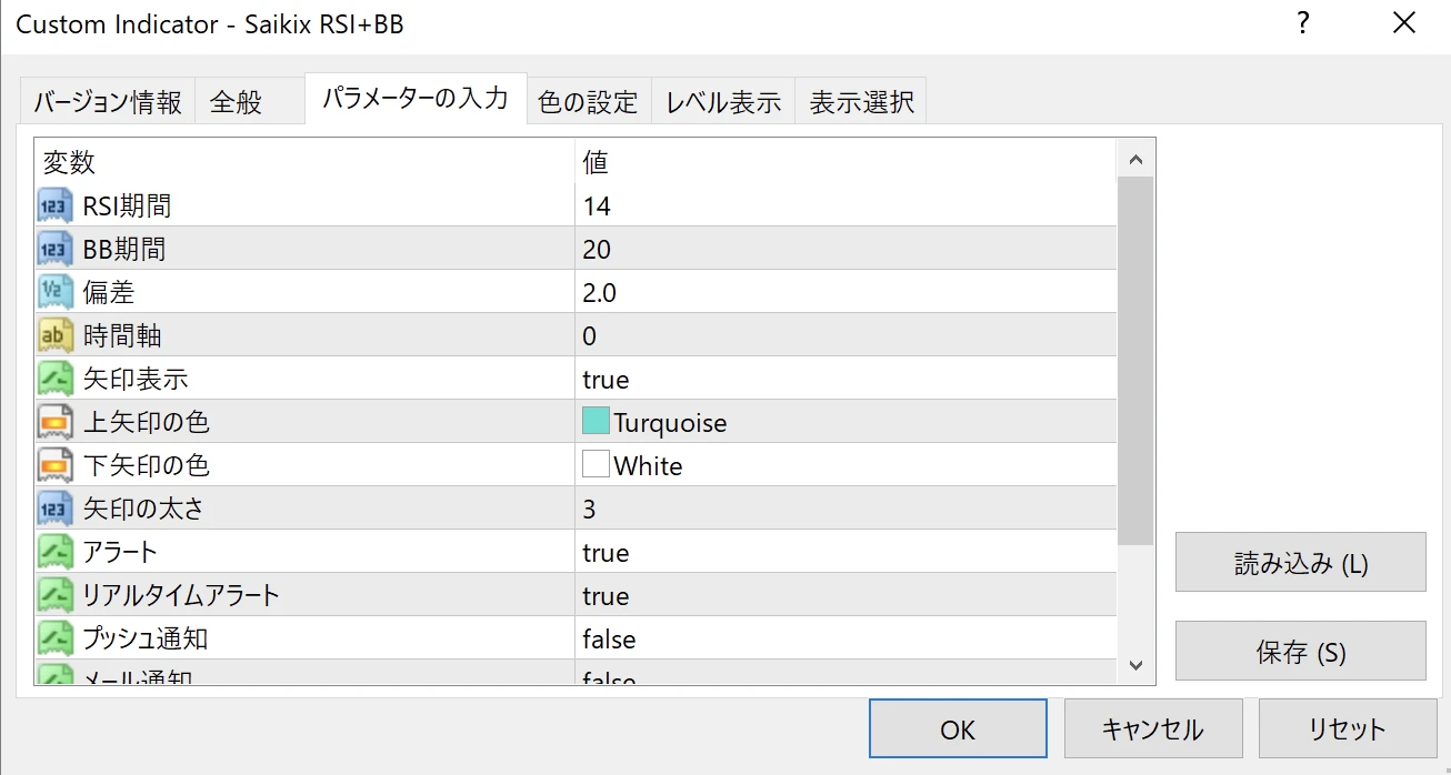 RSIやボリンジャーバンドの期間、表示させたい偏差(シグマ)は自由に選択していただくことができます。また矢印表示を「false」にしていただくことで、矢印シグナルを非表示にしてボリンジャーバンドを表示させたRSIのみを表示することが可能です。