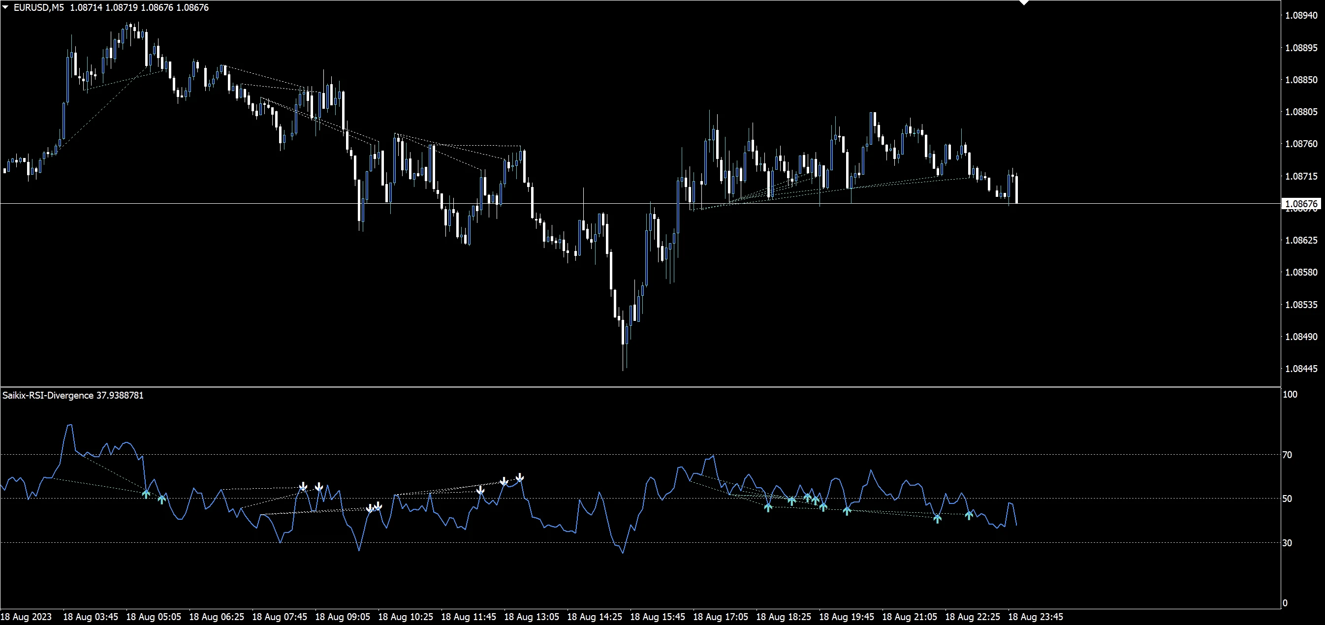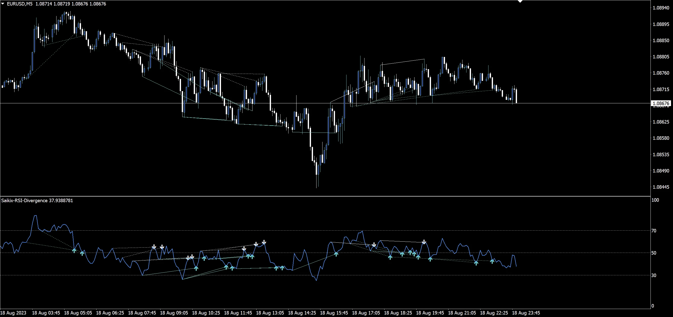 ダイバージェンスが起きた際には、逆行を表すトレンドラインが描画されます。ダイバージェンスとヒドゥンダイバージェンスを同時・もしくはどちらか一方だけ表示できるのに加えて、ローソク足、RSIの両方にダイバージェンスのサイン(線)を表示させることができます。