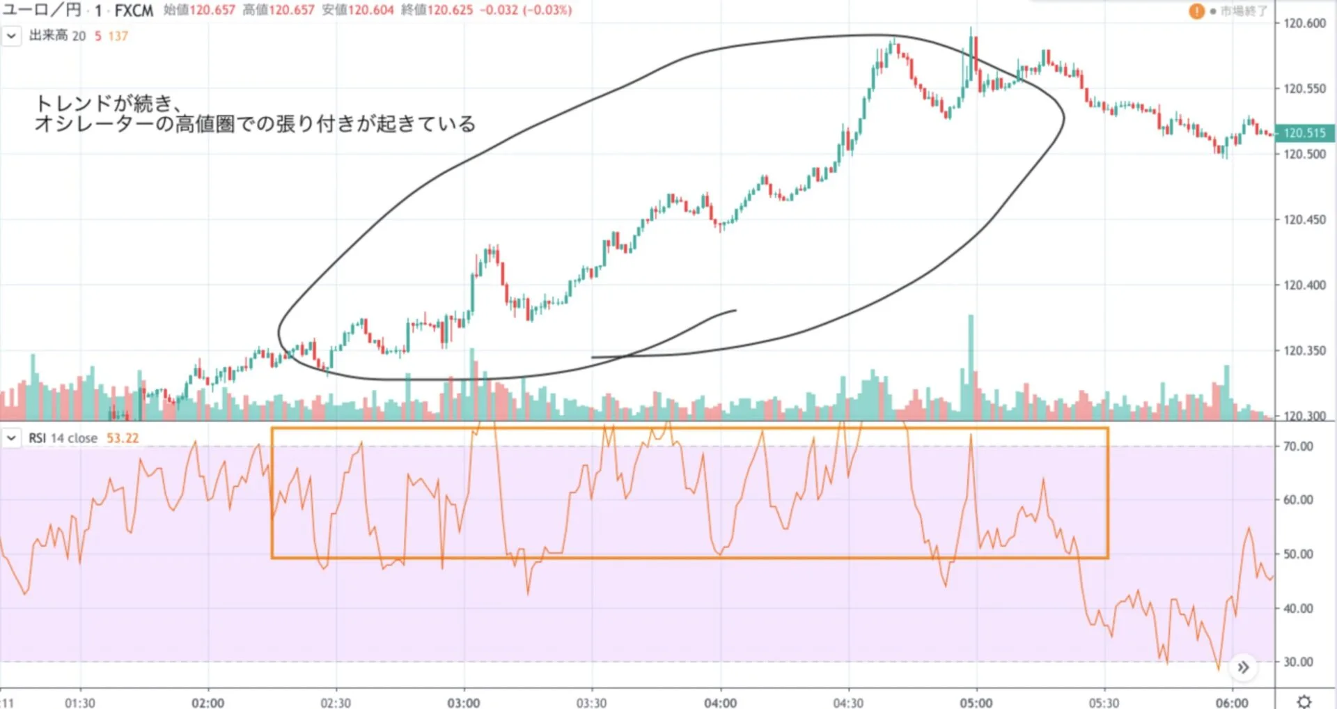トレンド相場含め、他のレンジ相場で使っても、ボリバンの場合はバンドウォークが起きたり、オシレーターの天井/底での貼り付けが起き、だいたい負けます。