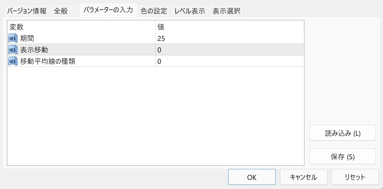 表示させる移動平均線の期間、表示移動(シフト)、移動平均線の種類などはお好みで選択することができます。