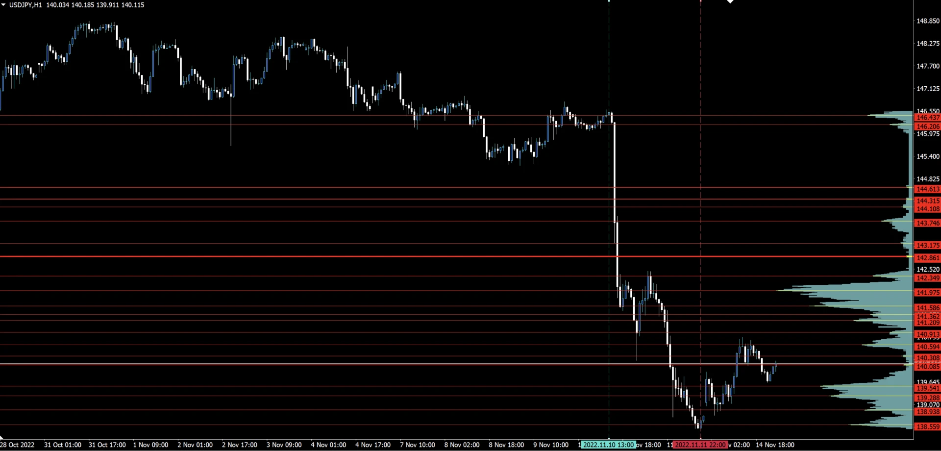 急落に対して価格帯別出来高を表示