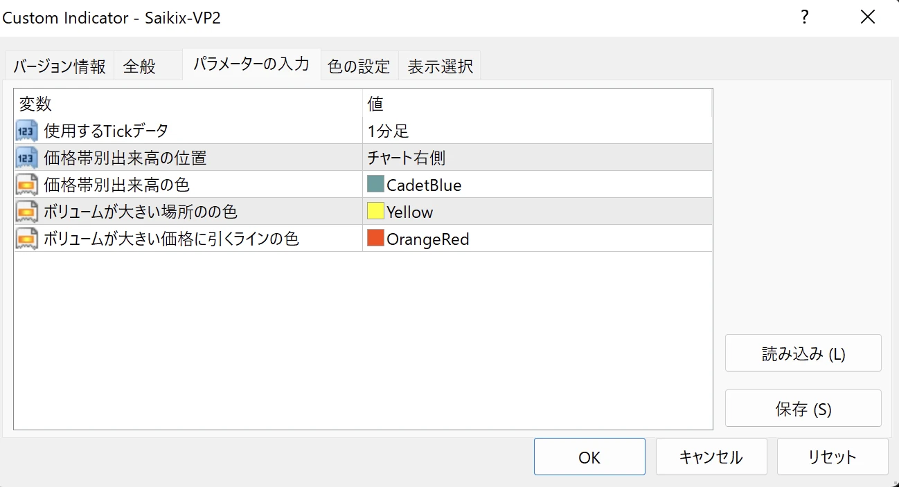 - 使用するTickデータ...1分足、5分足、15分足の中からどの時間帯の出来高を表示するか決めることができる